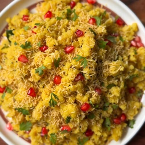 – Transfer the hot, yellow, juicy Khamani into a bowl.– Top generously with Nylon Sev (the crunch is mandatory!).– Sprinkle Pomegranate seeds for a pop of red and sweetness.– Garnish with fresh Coriander. Serve immediately!ㅤㅤㅤㅤ