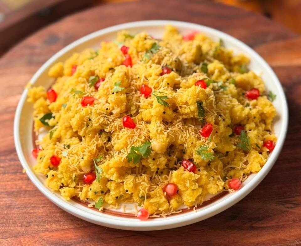 It involves steaming fresh Chana Dal (split chickpeas), crumbling it into grains, and then cooking it again in a sweet, tangy, and spicy tempered water until it becomes melt-in-the-mouth soft. The burst of juicy garlic-ginger water, the crunch of Sev, and the sweetness of raisins make this dish an explosion of flavours.
