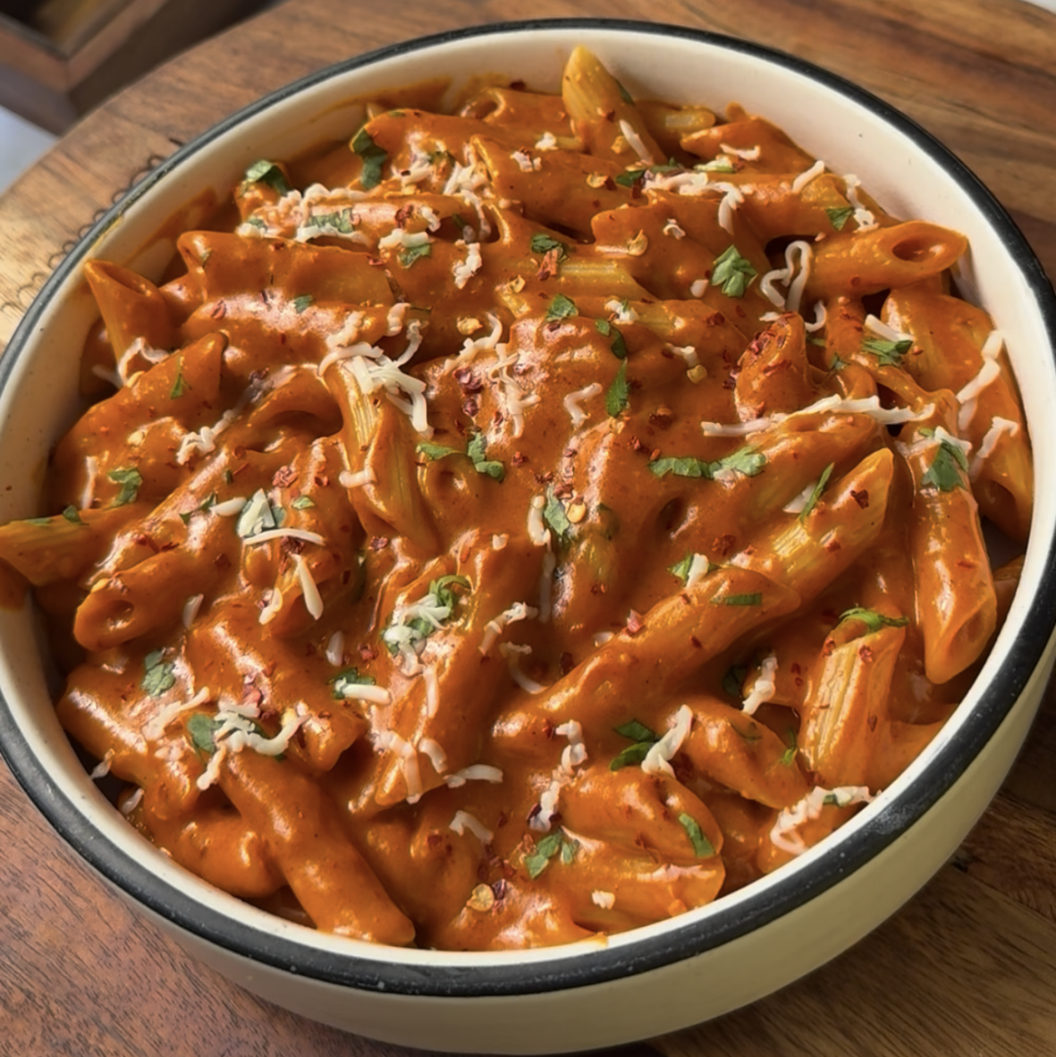 – Add the Chilli Flakes and half of the fresh Coriander into the sauce.– Now, toss in your Boiled Pasta.– Mix: Gently fold the pasta into the sauce. Ensure every single piece is coated in that orange creamy goodness.Simmer & Absorb